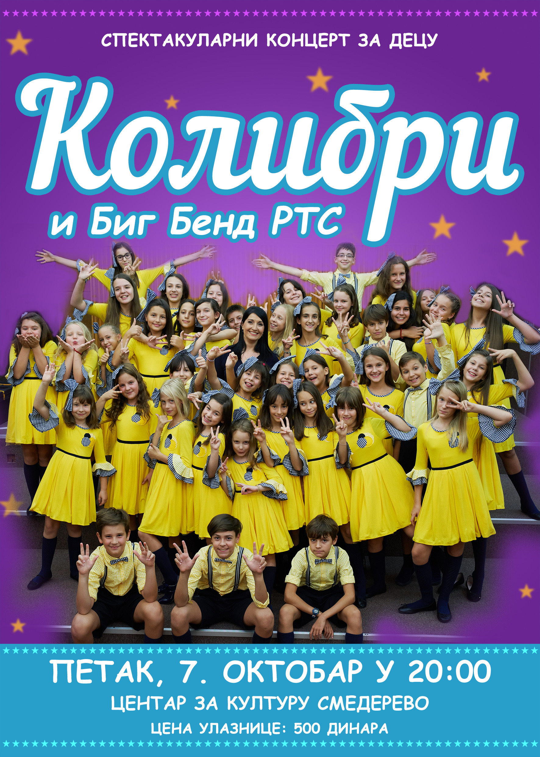 У оквиру “Дечије недеље” хор “Колибри” и Биг Бенд РТС одржаће концерт у петак, 7. октобра са почетком у 20 часова у Великој дворани Центра за културу Смедерево. Најмлађа публика имаће прилику да ужива у најлепшим песмама за децу у извођењу овог прослављеног хора под диригентском управом Љиљане Ранђеловић и врхунских џез музичара Биг Бенда Радио телевизије Србије. Цена улазнице је 500 динара. Улазнице се могу набавити на билетарници Центра за културу Смедерево.