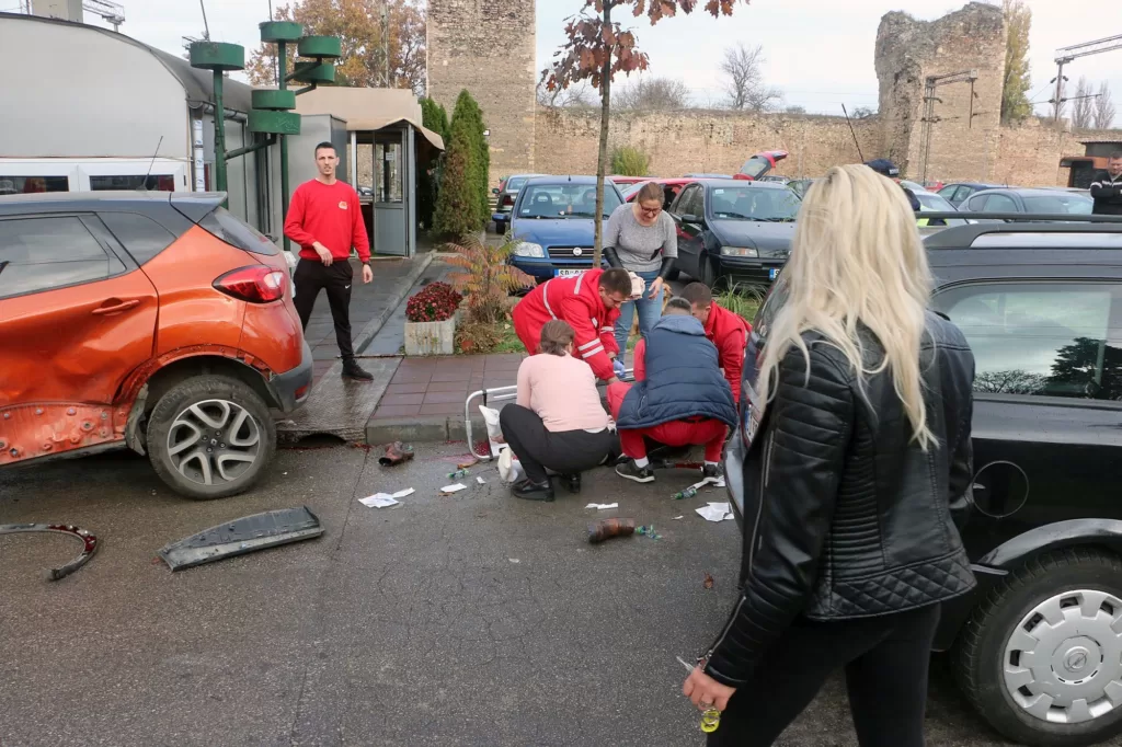 Jedna zenska osoba zadobila je teske telesne povrede,kada je na nju naleteo automobil u centru Smedereva u prepodnevnim casovima.Saobracajna nesreca se desila oko 10h.,u blizini Muzeja u Smederevu,kada je na zenu staru 53godine,koja je stajala na kolovozu,spremajuci se da udje u auto ,naleteo drugi automobil.Inace automobilom koji je izazvao saobracajnu nezgodu,upravljala je takodje zena.Najverovatnije,vozac koji je izazvao saobracajnu nezgodu,nije uspeo da savlada ostru krivinu,zbog mokrog kolovoza i verovatno vece brzine od dozvoljene.