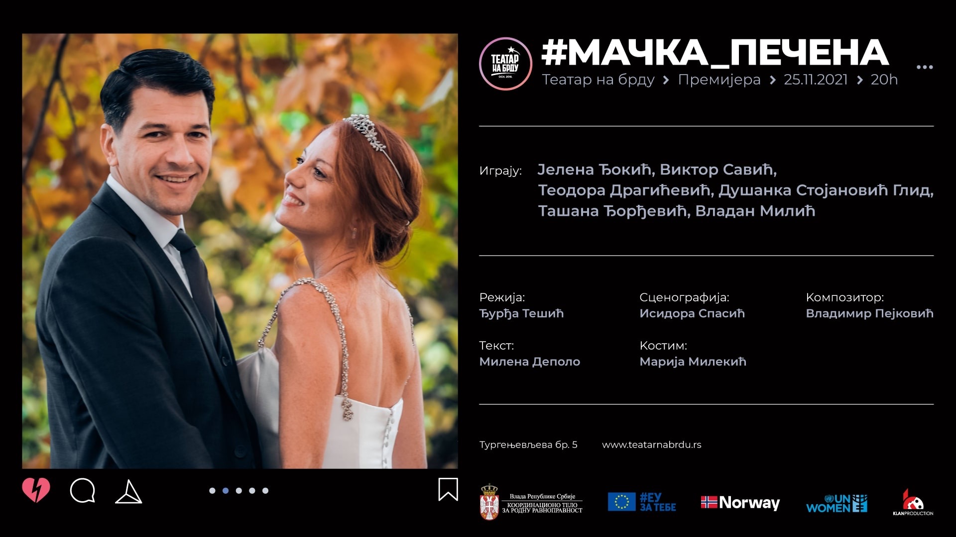 Пoзоришна представа “Мачка печена” у продукцији Театра на брду, у режији Ђурђе Тешић, а по тексту Милене Деполо, биће изведена 26. 11. у Великој дворани Центра за културу Смедерево са почетком у 20 сати.