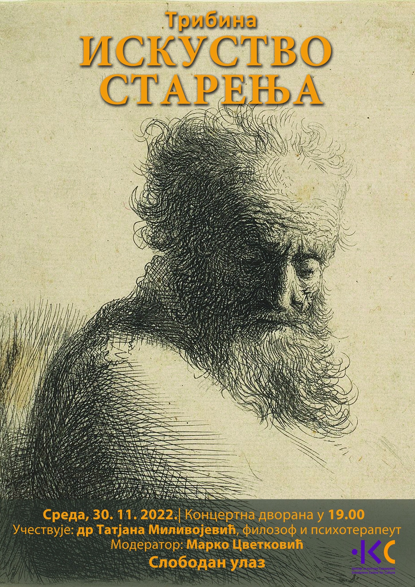 Искуство старења тема је трибине која ће се одржати у Центру за културу Смедерево, у среду, 30. новембра, са почетком у 19 сати. Гошћа је проф. др Татјана Миливојевић, филозоф и психотерапеут. Улаз је слободан.