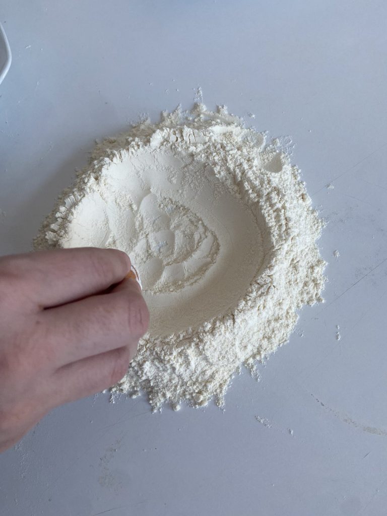 Izmeriti prosejano brašno i napraviti “vulkan” od brašna sa rupom u sredini.