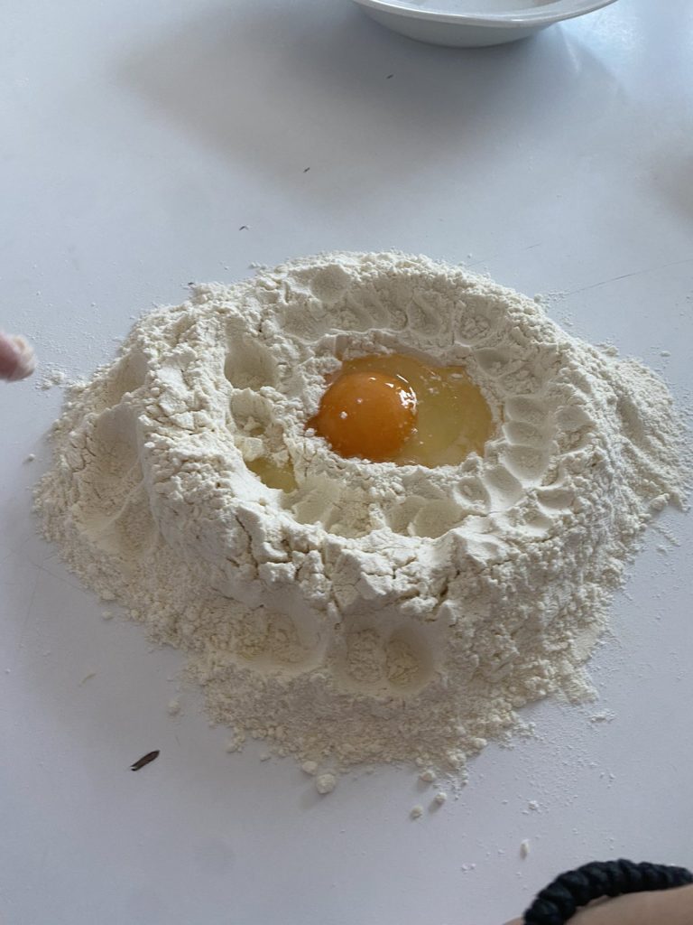 Jaja smestiti u sredinu “vulkana”, tako da ne prelivaju. Ovo je najbitniji korak. Ukoliko se desi da nemate gde da smestite poslednje jaje, nemojte ga dodavati odmah već probajte da napravite još malo mesta za njega. Ukoliko se razlije van brašna, nikako ne vraćajte unutra. Dodajte kašiku ulja.