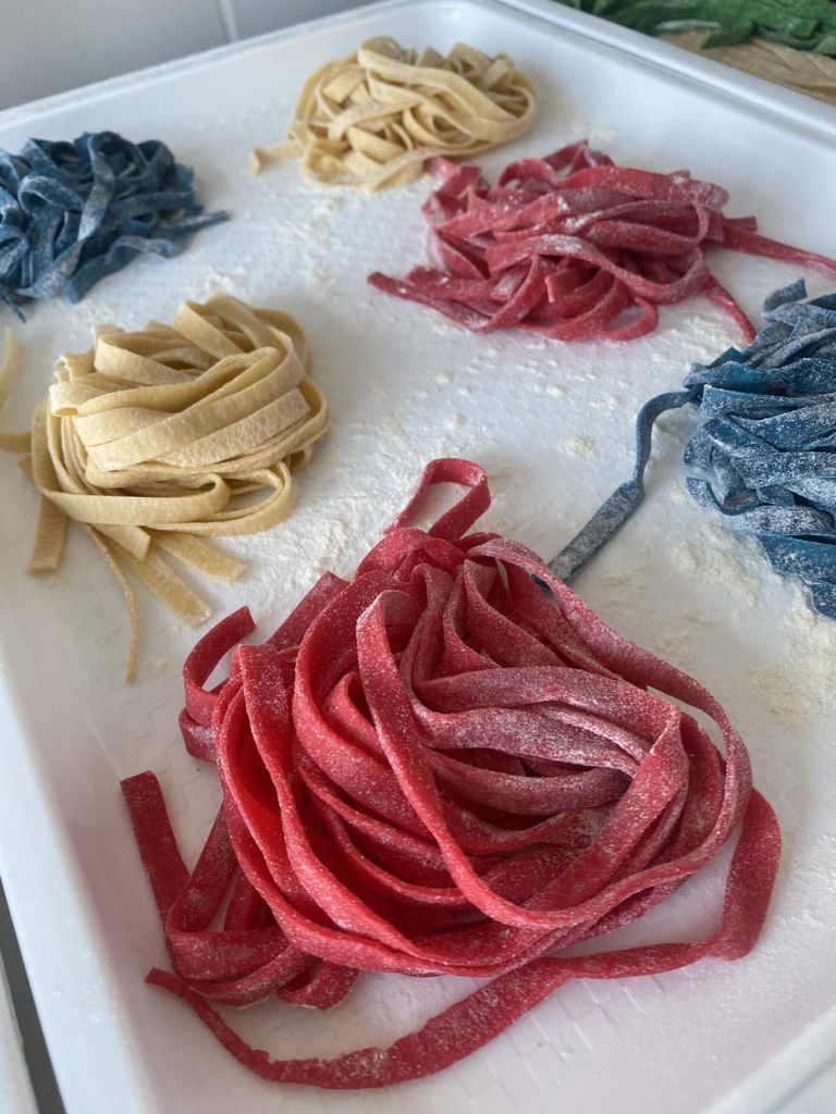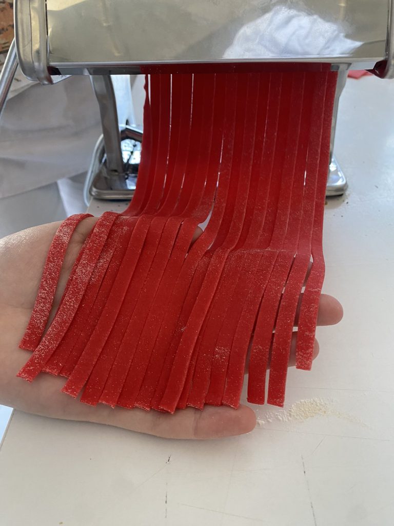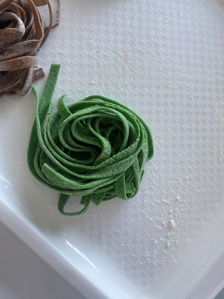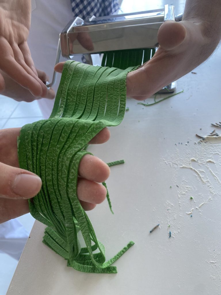 Napravite 3-4 loptice (u zavisnosti od veličine mašine). Naštelujte mašinu na veći razmak (od 5-9). Oklagijom pređite preko loptice do debljine do 5 mm. Pospite malo brašna preko testa da biste spečiti mogućnost lepljenja u razmaku mašine. Provucite testo kroz mašinu.