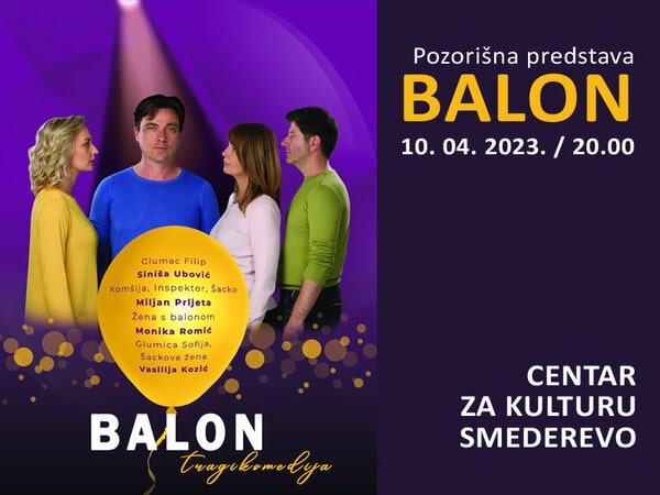 Predstava “Balon“ u produkciji Teatra Vuk, rađena prema tekstu Mata Matišića, a u režiji Monike Romić biće izvedena pred publikom u Velikoj dvorani Centra za kulturu Smederevo u ponedeljak, 10. aprila sa početkom u 20 sati. U predstavi igraju Siniša Ubović, Miljan Prljeta, Monika Romić i Vasilija Kozić. Cena ulaznice je 700 dinara.