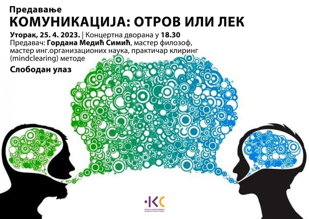 “Komunikacija: otrov ili lek“ tema je predavanja koje će u utorak, 25. aprila, u Centru za kulturu Smederevo održati Gordana Medić-Simić, filozof, inženjer organizacionih nauka i praktičar kliringa. Program će se održati u Koncertnoj dvorani sa početkom u 18.30, a ulaz je slobodan.