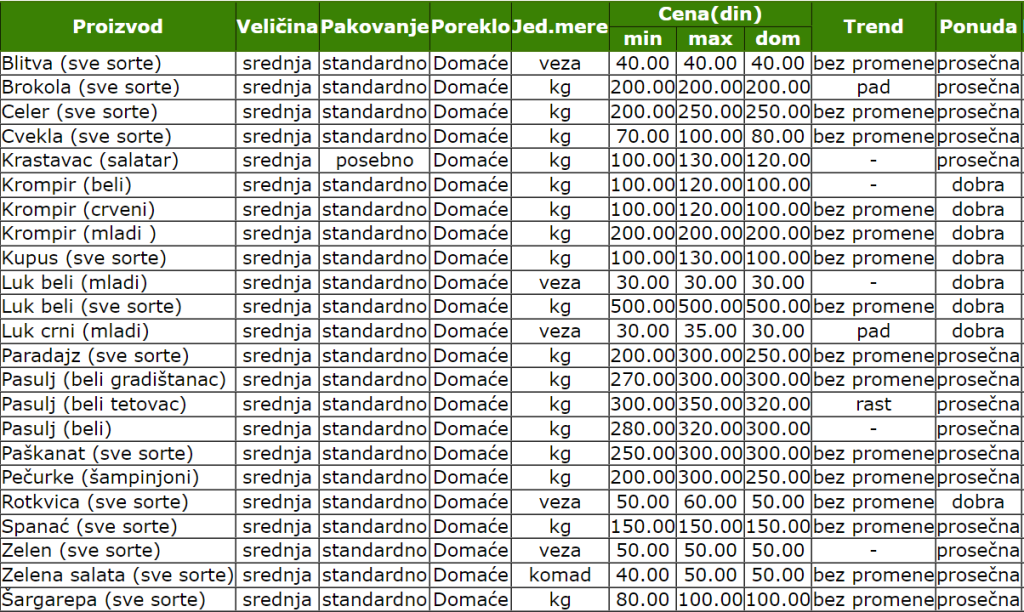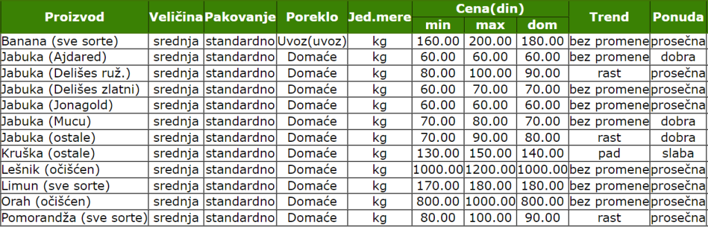 Na Zelenoj pijaci u Smederevu u periodu od 1. do 7. maja zabeležene su sledeće cene voća i povrća.