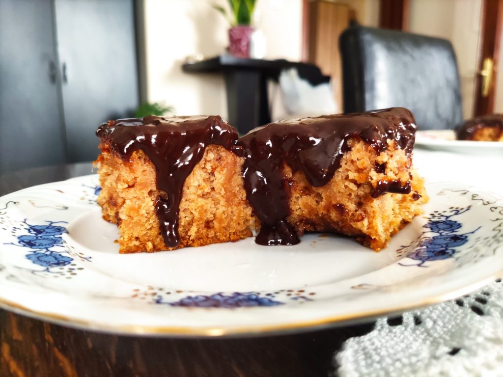 Umutiti jednu čašu (od jogurta) šećera, jednu čašu (od jogurta) vode, pola čaše (od jogurta) ulja, dve čaše (od jogurta) brašna, pola kašičice sode bikarbone, dve kašike džema (najbolje od šljiva). Opciono dodajte kašičicu cimeta i po želji malo suvog voća. Sipati u podmazan i brašnom posut đuveč, peći na 200 stepeni 20 minuta. Kada je kolač gotov izvaditi, premazati sa četiri kašike džema, odozgo glazura od 150 g čokolade (otopljena čokolada sa malo ulja).