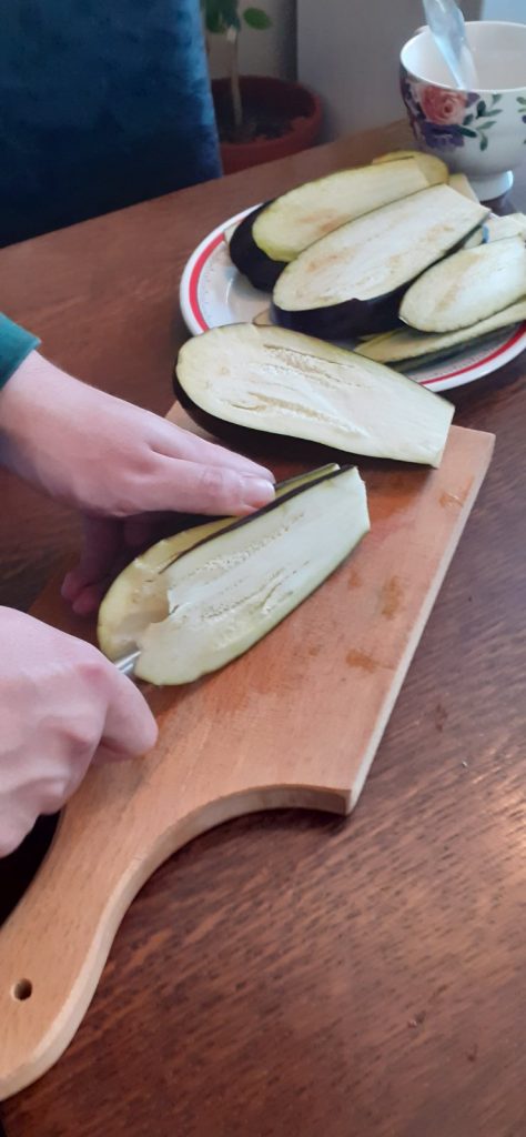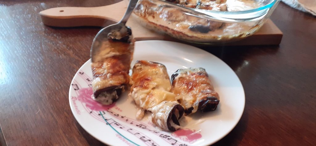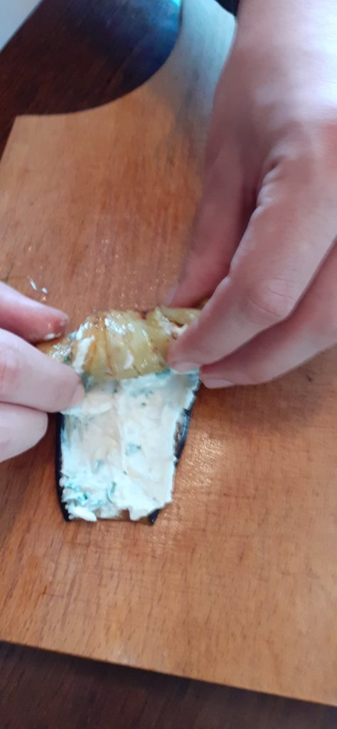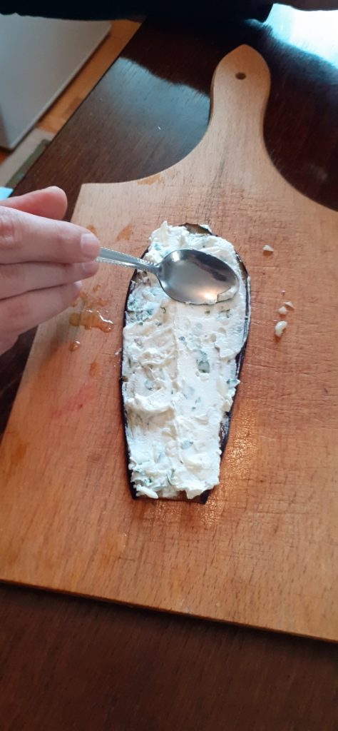 Plavi paradajz seći uzduž, na tanje trake. Premazati ga uljem s obe strane i pržiti na tihoj vatri dva, tri minuta. U činiju izmešati peršun, krem sir, so, biber, origano i izrendani kačkavalj. Svaku traku plavog paradajza premazati ovom masom, urolati i staviti u vatrostalnu činiju. Odozgo posuti rendanim i na kocke seckanim kačkavaljem. Peći petnaestak minuta na 180 stepeni.