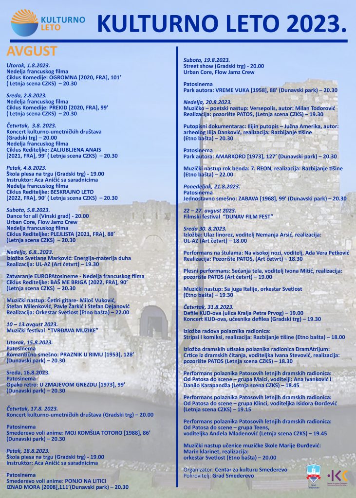 U toku prethodnog meseca uživali smo na više lokacija u Smederevu bogatim kulturnim sadržajem, a i u avgustu nas očekuju brojni zanimljivi kulturni događaji. Sada možete videti i kompletan program za avgust.