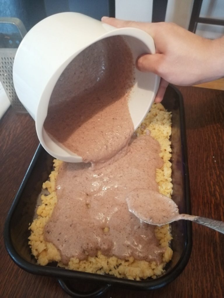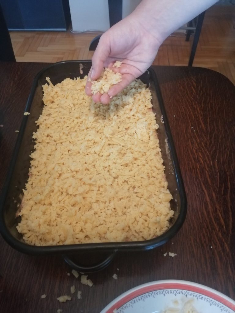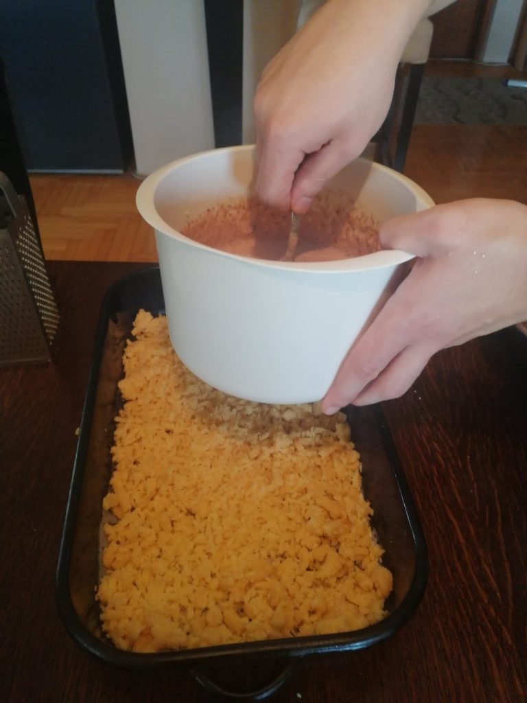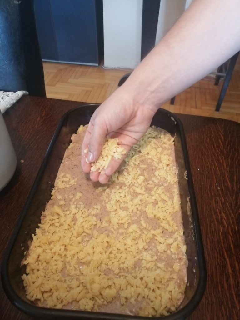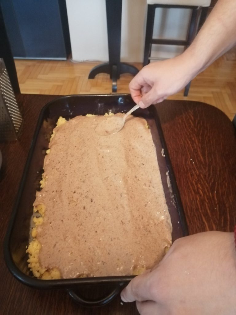 Kada se stegne dva dela izrendati u đuveč ili tepsiju, preko toga dodati umućen fil. Preko fila izrendati ostala dva dela. Peći na 180 stepeni 20 minuta.