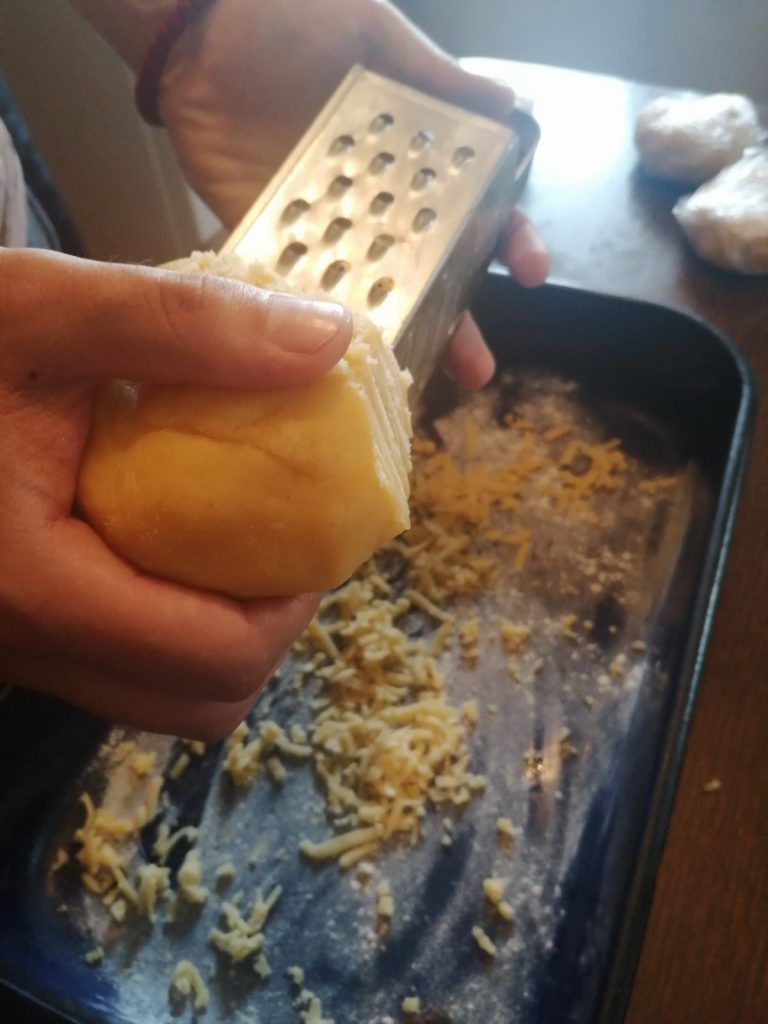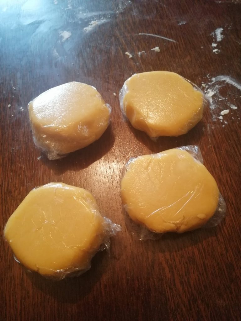 Umutiti 150 g masti sa 100 g šećera, dodati 4 žumanca, 4 kašike mleka, prašak za pecivo i brašno. Napravljeno testo podeliti na 4 dela (4 jufke – 4 lopte), uviti u foliju i staviti 30 min u zamrzivač. (Priprema fila u međuvremenu: 4 belanca umutiti sa 200 g šećera, dodati 3 kašike džema i 150 g mlevenih oraha).