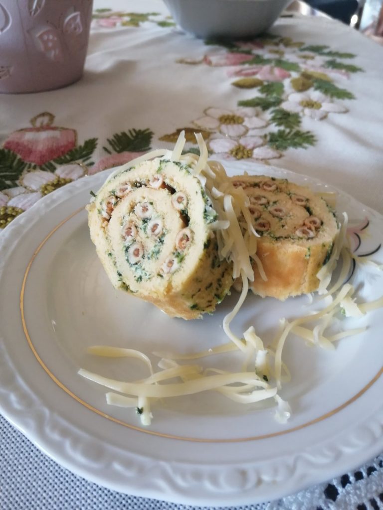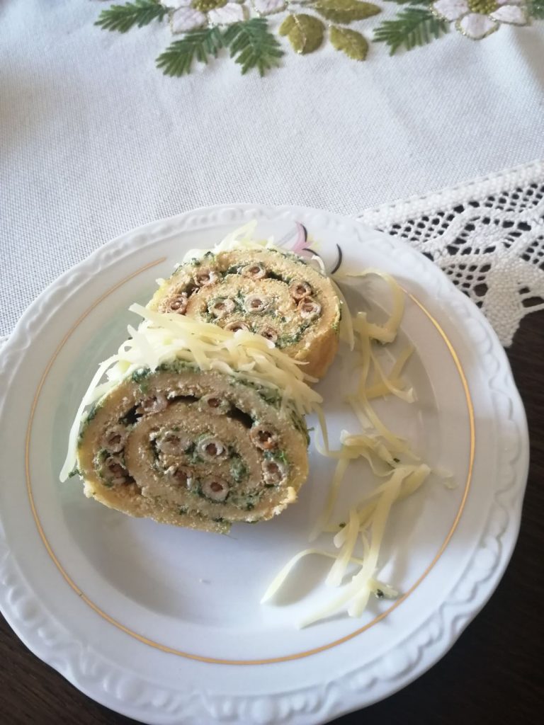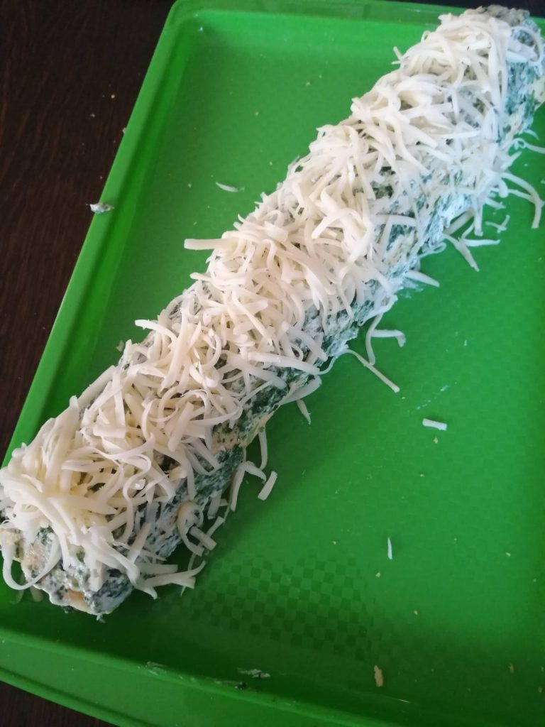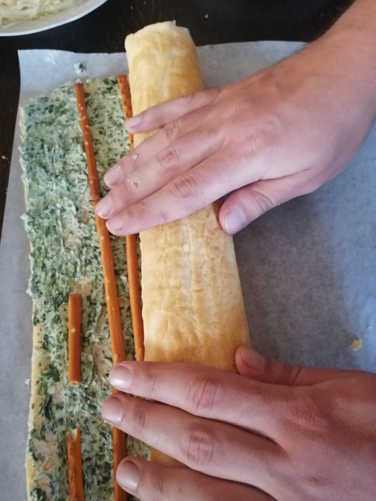 Obariti pola kilograma spanaća. Kad je obaren iscediti ga, malo propržiti sa pola kašičice soli. Kad se spanać ohladi, dodati dva krem sira i izmešati (sjediniti). Filovati koru, preko fila ređati štapiće od kikirikija, uviti koru kao rolat i sa istim filom premazati i odozgo. Posuti rendani kačkavalj preko rolata. Ostaviti da se ohladi sat vremena.