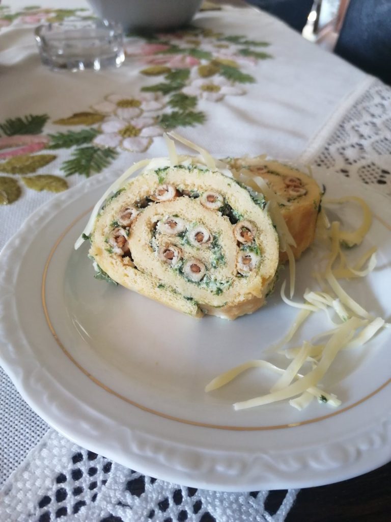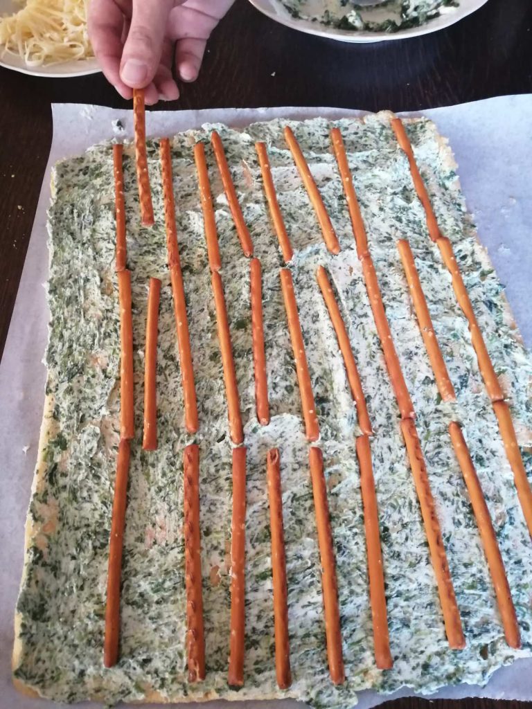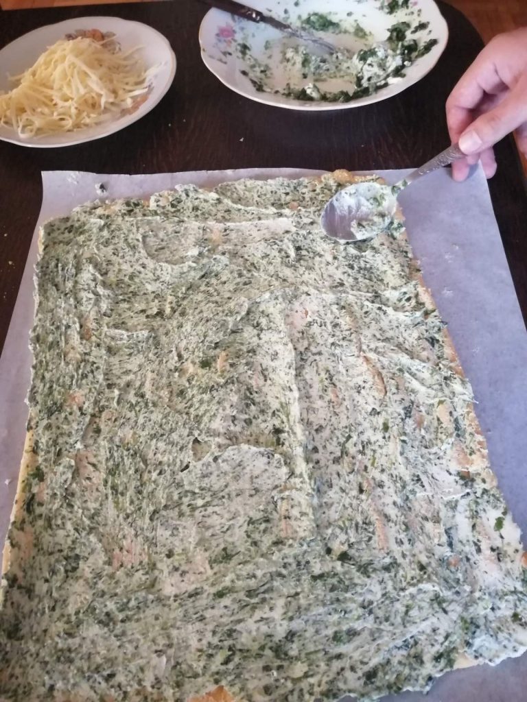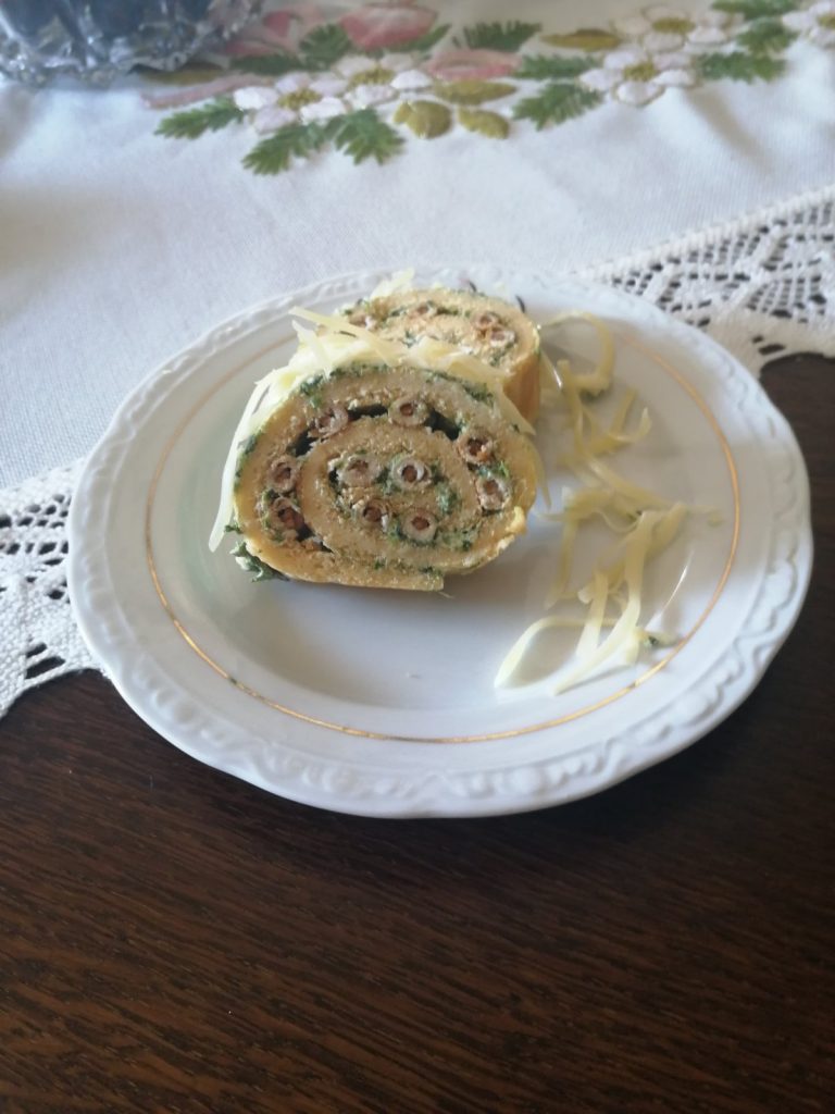 Obariti pola kilograma spanaća. Kad je obaren iscediti ga, malo propržiti sa pola kašičice soli. Kad se spanać ohladi, dodati dva krem sira i izmešati (sjediniti). Filovati koru, preko fila ređati štapiće od kikirikija, uviti koru kao rolat i sa istim filom premazati i odozgo. Posuti rendani kačkavalj preko rolata. Ostaviti da se ohladi sat vremena.