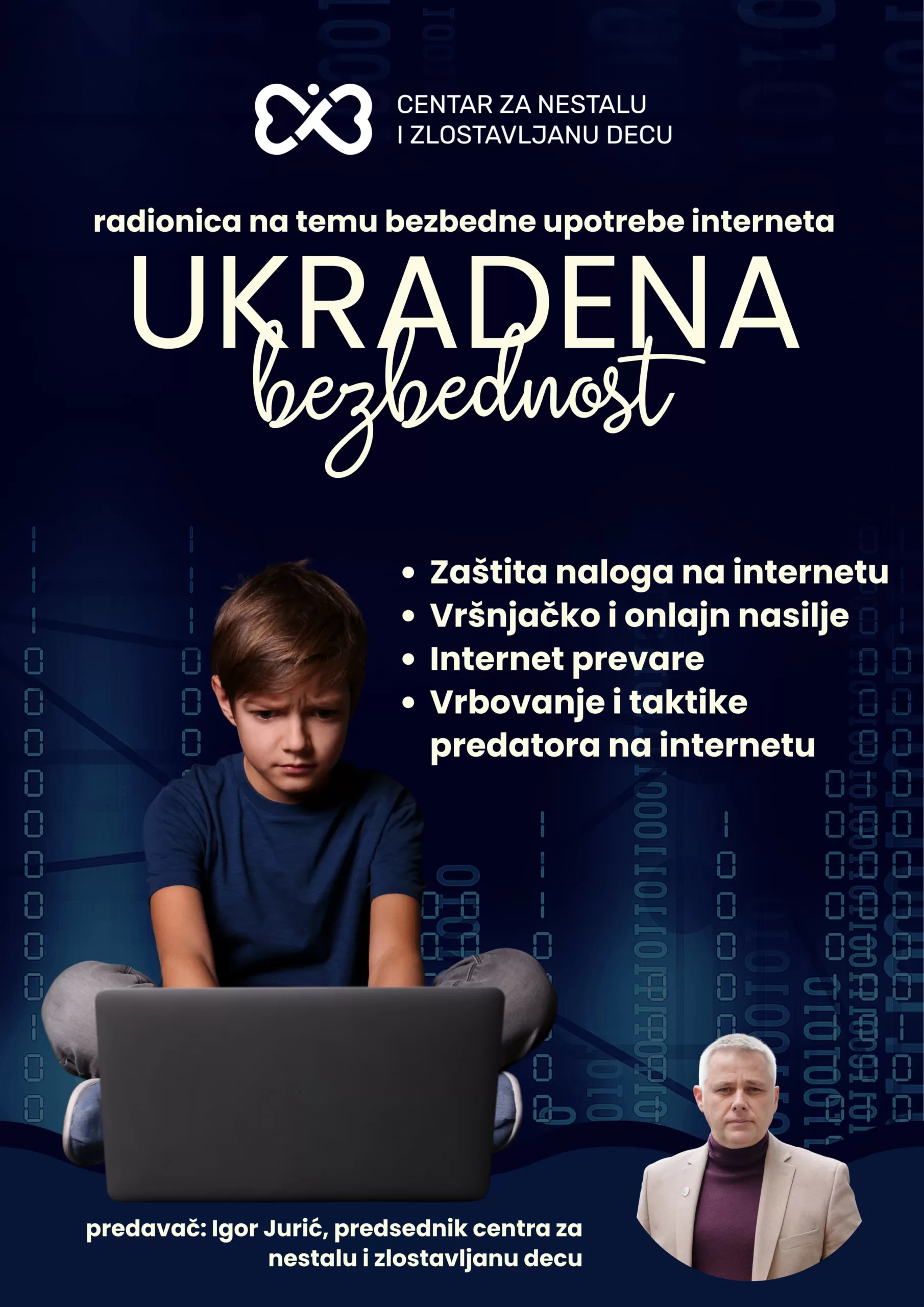 Na tribini će biti obrađene sve važne teme koje se tiču bezbednosti dece na internetu (zaštita naloga na internetu, vršnjačko i online nasilje, internet prevare, vrbovanje i taktike predatora na internetu).