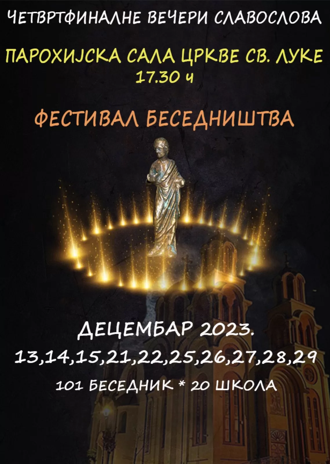 Takmičenje u besedništvu (četvrtfinale) za učenike srednjih škola, koje organizuje smederevska crkvena zajednica, održaće se u galerijskoj sali parohijskog doma pri Crkvi Svetog Luke, u periodu od 13. do 29. decembra 2023. godine.