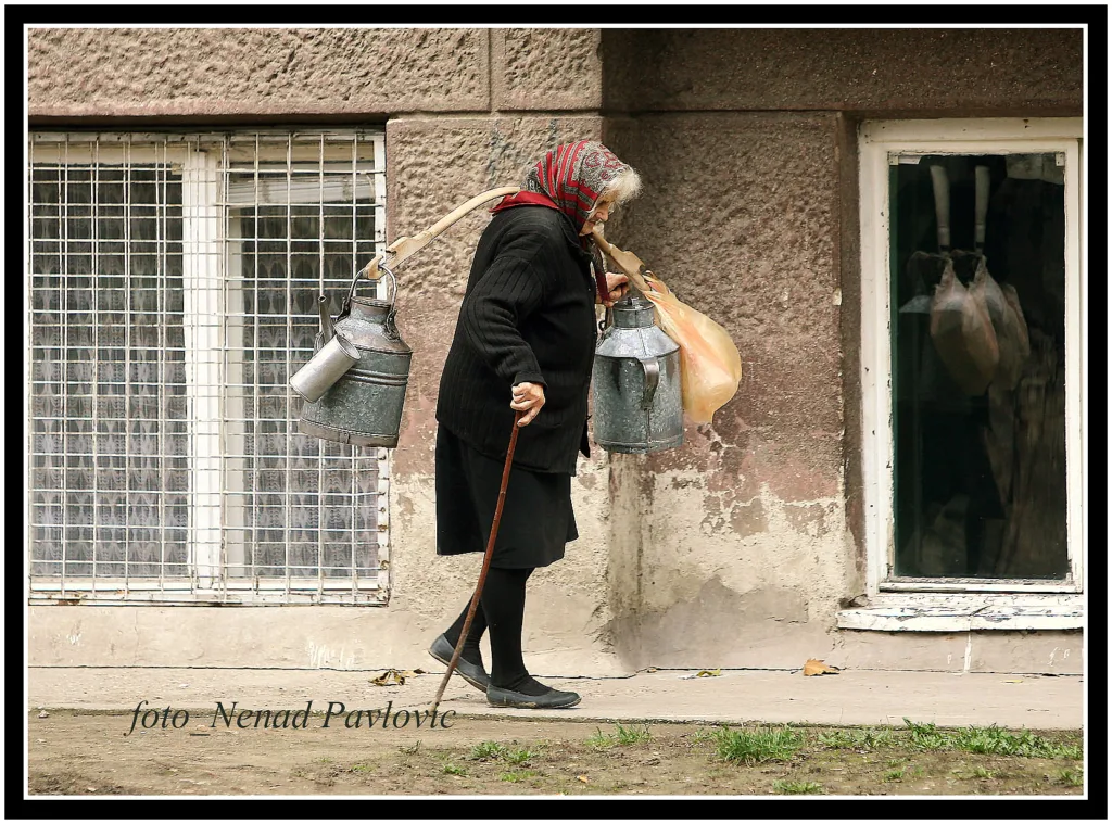 Prošla je decenija i po od nastanka ove fotografije, verovatno jedne od poslednjih mlekadžika u našem gradu! Ova fotografija me vraća u neko prošlo vreme, kada bi kucanje na vratima, u ranim jutarnjim satima najavilo dolazak mlekadžike sa tek nedavno pomuženim mlekom. Sveže skuvano domaće mleko i tek ispečena štrudla sa makom, svojim mirisima mamili su na doručak! Velika razlika, jer danas u supermarketima, kupujete dugotrajno, pasterizovano mleko, sa ili bez masti, bez laktoze i slično. Zato molim moje drage sugrađane za pomoć u nalaženju identiteta bake sa ove fotografije.