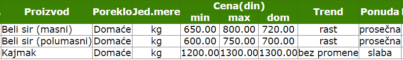 Share Facebook Twitter LinkedIn Pinterest EmailPonuda i cene mlečnih proizvoda, jaja i piletine na pijačnim tezgama u periodu od 19. do 25. februara 2024. godine.Izvor: STIPSIzvor: STIPS