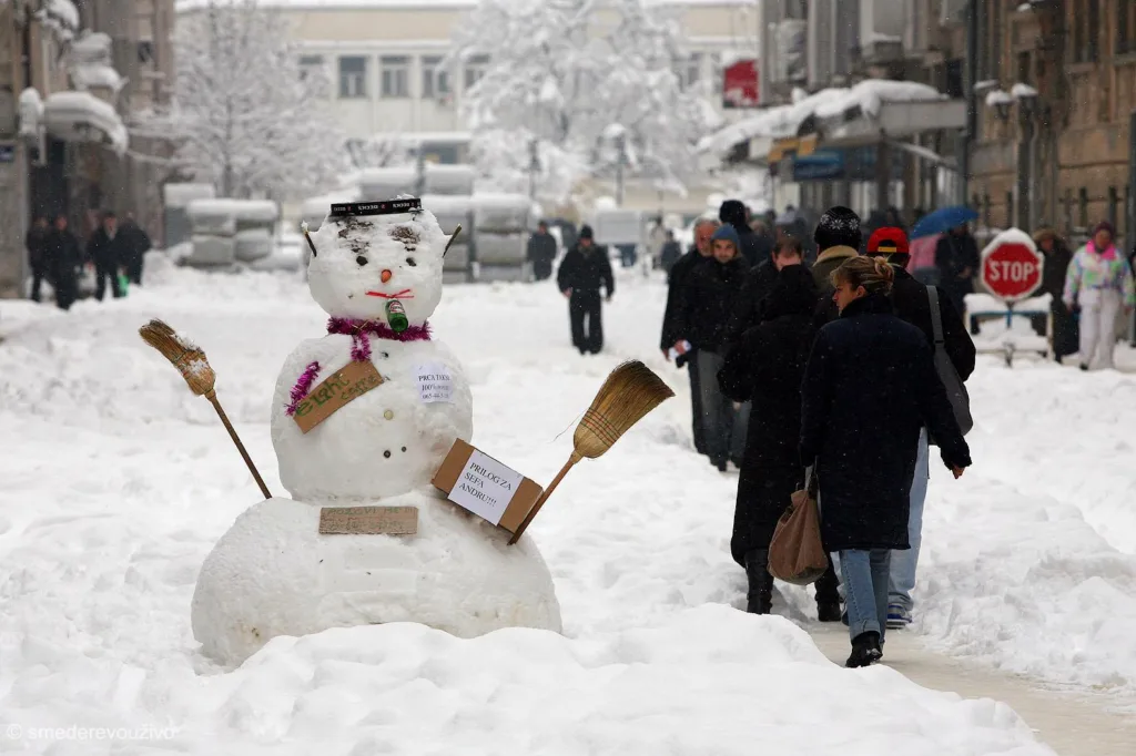 Drage moje Smederevke i dragi Smederevci i ove zime sneg je ,,zaboravio” da pada u našem lepom gradu. Zato sada želim da podelim moje fotografije iz arhive, kada je u ulici Kralja Petra napravljen sneško, ljudske veličine, a naša lepa Tvrđava čišćena od snega na ,,ekološki” način, bez upotrebe mašina! I ove godine smo umesto sanki, našim mališanima vadili iz ostava bicikle, trotinete, rolere… Nadamo se da sledeće godine, sneg nećemo gledati samo na fotografijama!