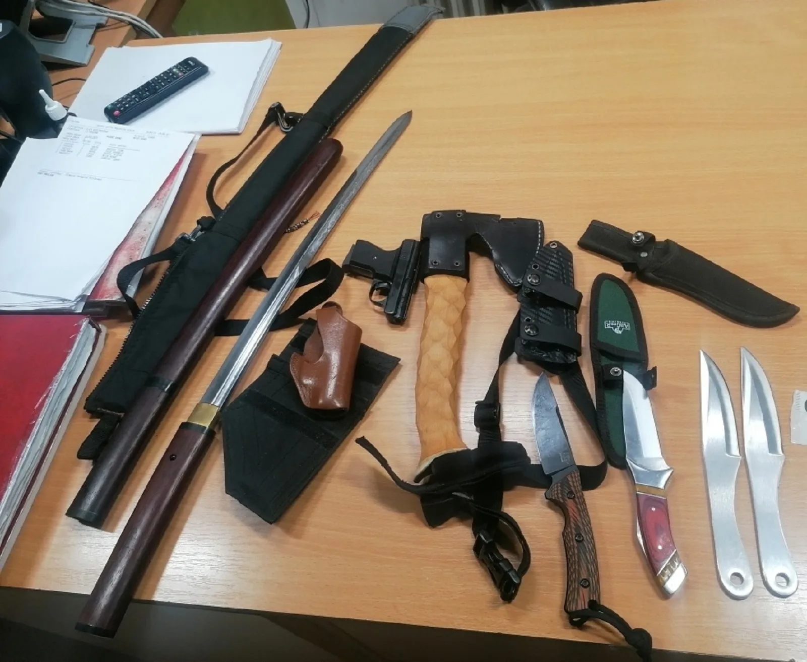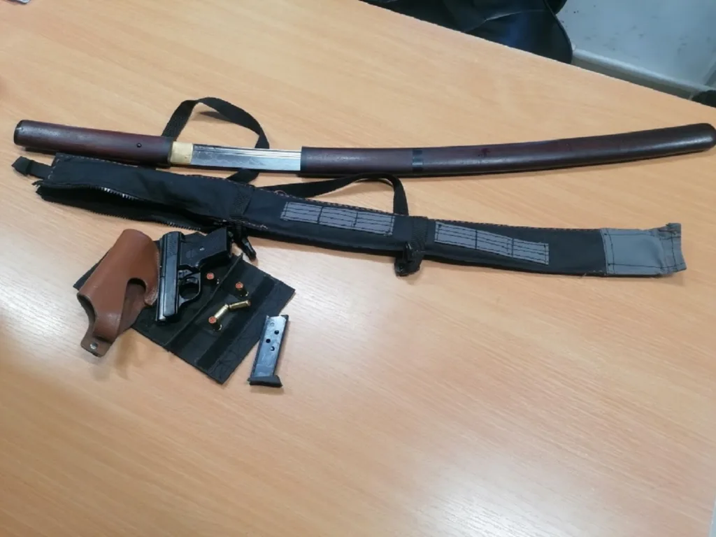 Detaljna kontrola pokazala je da se u unutrašnjim pregradama automobila krije japanski samurajski mač (katana) u futroli, četiri noža i jedna sekira, gasni pištolj „Record mod. 15-9“, sa pripadajućim okvirom i 5 petaka od 9mm.