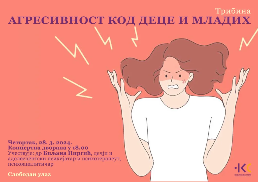 Govoriće o tome dr Biljana Pirgić, dečji i adolescentski psihijatar i psihoterapeut, psihoanalitičar – na tribini “Agresivnost kod dece i mladih: od zdravlja do poremećaja”, u četvrtak, 28. marta, u 18 časova u koncertnoj dvorani Centra za kulturu Smederevo.