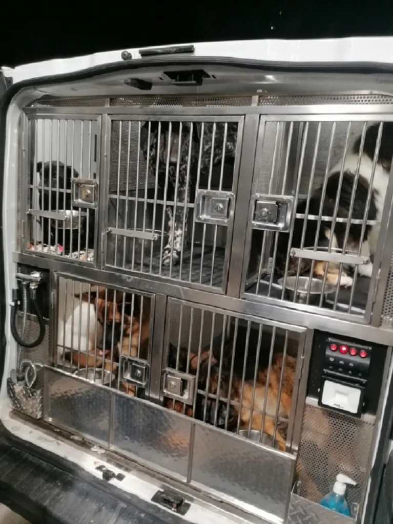 U tovarnom delu kombija i prtljažniku automobila zatečeni su kavezi sa dvadeset jednim primerkom devet različitih pasmina, među kojima su najbrojnije bile pudle (6), korgi (4), po dva maltezera, kolija, nemačka ovčara i stafordskog bul terijera i po jednim primerkom francuskog buldoga, basendžija i nemačkog kratkodlakog ptičara.