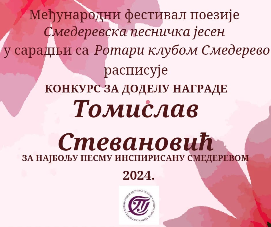 - Međunarodni festival poezije Smederevska pesnička jesen u saradnji sa Rotari klubom Smederevo raspisuje KONKURS ZA DODELU NAGRADE TOMISLAV STEVANOVIĆ ZA NABOLJU PESMU INSPIRISANU SMEDEREVOM