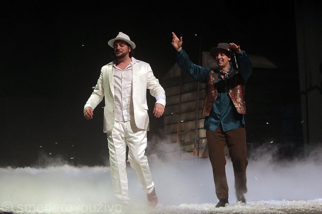 Glumačku ekipu koja je sinoć odigrala “Skupljače perja” u Velikoj dvorani, publika je nagradila gromoglasnim aplauzom.