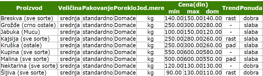 Share Facebook Twitter LinkedIn Pinterest EmailIzvor: Sistem tržišnih informacija poljoprivrede Srbije (STIPS)Cene obuhvataju period od 8. do 14. jula.