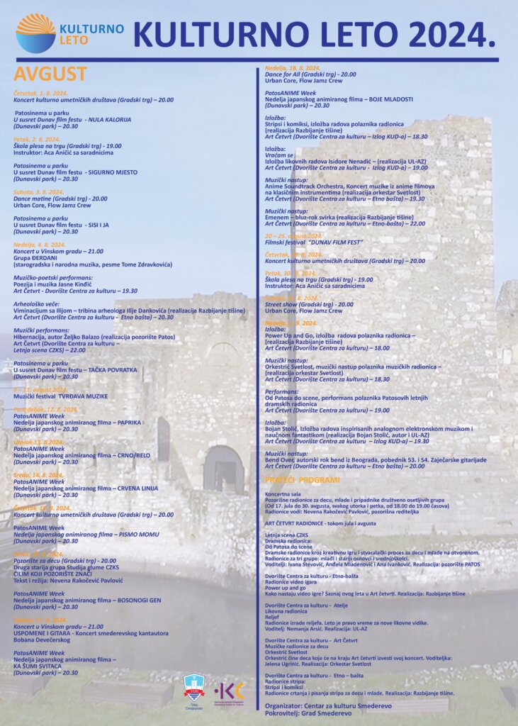 Podsetimo, u okviru manifestacije “Kulturno leto 2024” u Smederevu u avgustu možete pogledati: