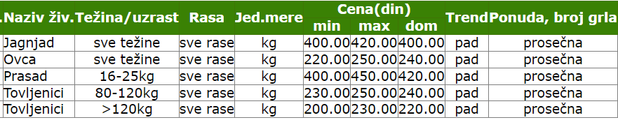 Share Facebook Twitter LinkedIn Pinterest EmailOvako su u Smederevu izgledale cene žive stoke od 29. jula do 4. avgusta.Izvor: Sistem tržišnih informacija poljoprivrede Srbije (STIPS)