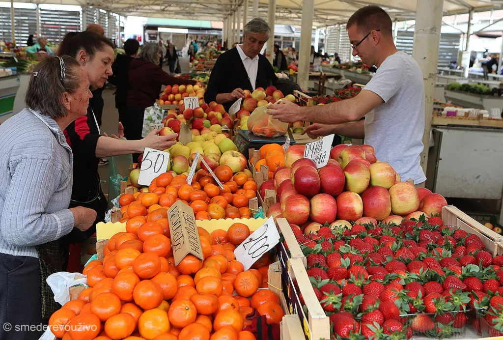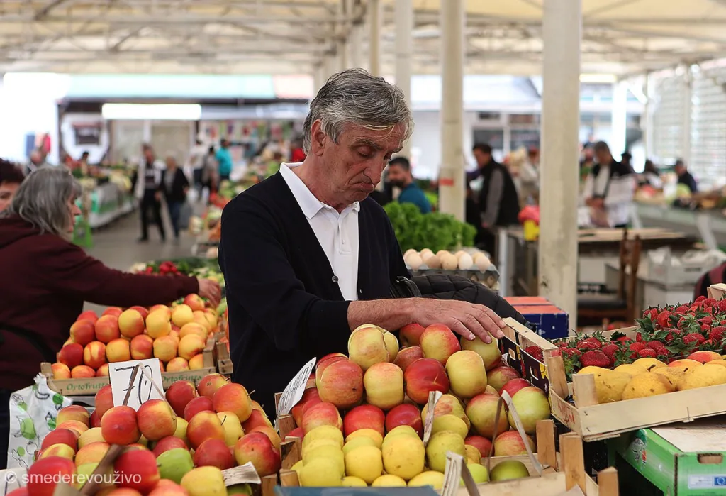 Zelena pijaca, voće i ljudi. Fotografisano tokom 2024. godine.