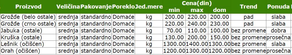 Share Facebook Twitter LinkedIn Pinterest EmailCene voća u Smederevu od 14. do 20. oktobra.Izvor: Sistem tržišnih informacija poljoprivrede Srbije (STIPS)