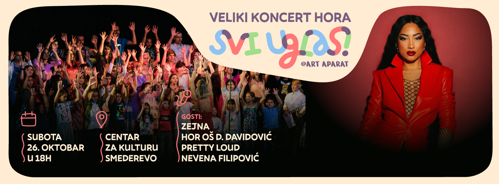 Хор СВИ УГЛАС одржаће концерт са гостима 26. октобра у Великој дворани Центра за културу Смедерево, са почетком у 18 сати. Публику очекује музичко путовање кроз поп, рок, евергрин и ромску музику, али и једно дирљиво искуство по којем је овај хор постао препознатљив. Са хором Сви УГЛАС ће наступити Зејна Муркић, дечији хор ОШ „Димитрије Давидовић“ из Смедерева, оркестар „Светлост“, бенд Pretty loud и Невена Филиповић.