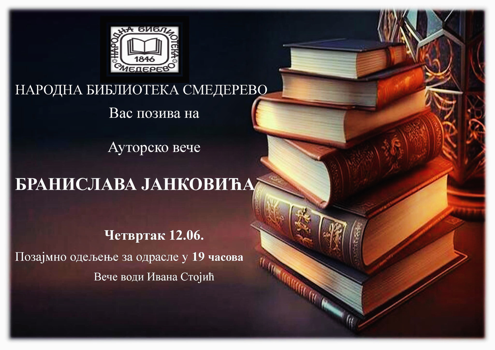 Позивамо вас на ауторско вече са Браниславом Јанковићем, у четвртак 12. јуна, у 19.00 часова, које ће се одржати на Позајмном одељењу за одрасле у Народној библиотеци Смедерево.