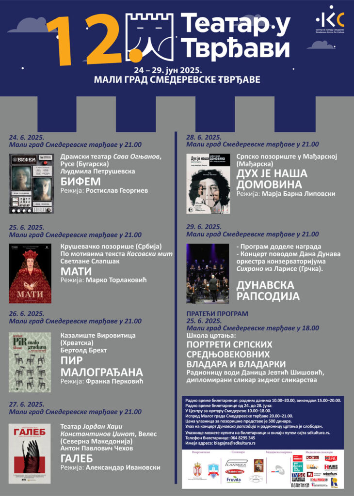 Дванаести, међународни позоришни фестивал „Театар у тврђави”одржаће се у периоду од 24. до 29. јуна у Малом граду Смедерeвске тврђаве. Фестивал ће 24. јуна отворити представа „Бифем” Драмског театра Сава Огњанов из града Русе у Бугарској. Према тексту Људмиле Петрушевске представу је режирао Ростислав Георгиев, а ликове мајке и ћерке које су стављене у смешно апсурдну и трагичну ситуацију тумаче глумице Ивана Керанова и Јасена Господинова. Подвргнуте чудном експерименту – изоловане од спољашњег света – приморане су да пронађу одговоре на давно заборављена, непостављена питања, да се суоче са дуго потискиваним истинама, да траже кривца за своје протраћене животе – неостваренеснове и изгубљене љубави. Границе између љубави и мржње се бришу, трагично се урушава у комично, а вулгарно флертује са узвишеним у гротескној бици, чије је бојно поље БИФЕМ. Представа је титлована на српски језик и не препоручује се млађима од 12 година. Представа „Мати” Крушевачког позоришта коју је по мотивима текста „Косовски мит” Светлане Слапшак режирао Марко Торлаковић, биће изведена 25. јуна. МАТИ је прича о женама средњовековне Србије, предвођене кнегињом Милицом, које су мудром дипломатском политиком, уз огромна одрицања и жртве, успеле да одрже мир на овим просторима пуних тринаест година. Историјске чињенице су само основа за приказивање митских ликова као правих особа, од крви и меса, са свим својим манама и врлинама. Играју: Биљана Николић, Јована Ђорић, Марија Марић, Ема