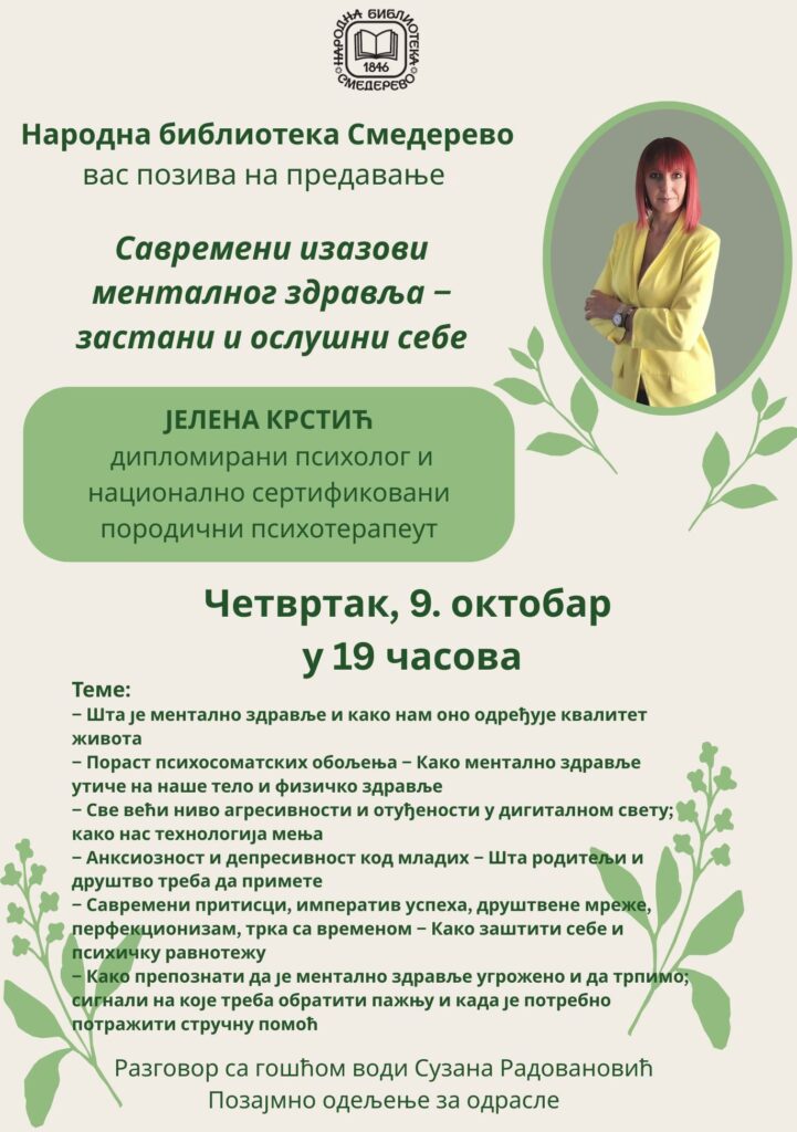 Позивамо вас да у четвртак 9. октобра, у 19.00 часова, присуствујете предавању Јелене Крстић, диломираног психолога и национално сертификованог породичног психотерапеута, које ће се одржати на Позајмном одељењу за одрасле у Народној библиотеци Смедерево. У прилогу овог мејла је плакат на коме можете видети теме предавања.