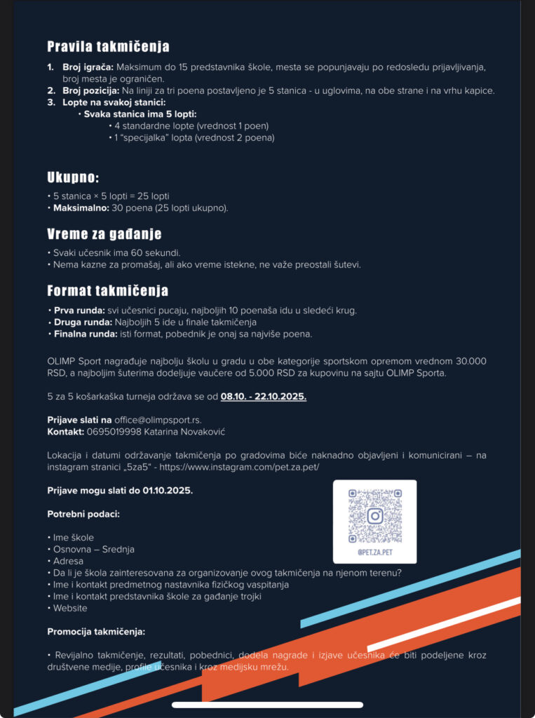 Kompanija Olimp Sport sa ponosom najavljuje sportski događaj koji inspiriše mlade i promoviše prave vrednosti, sportski duh i zdrav način života — takmičenje osnovnih i srednjih škola u šutiranju trojki „5 za 5“, koje će se održati u petak, 10. oktobra 2025. godine, u Sportskoj hali Smederevo, od 11 do 15 časova.