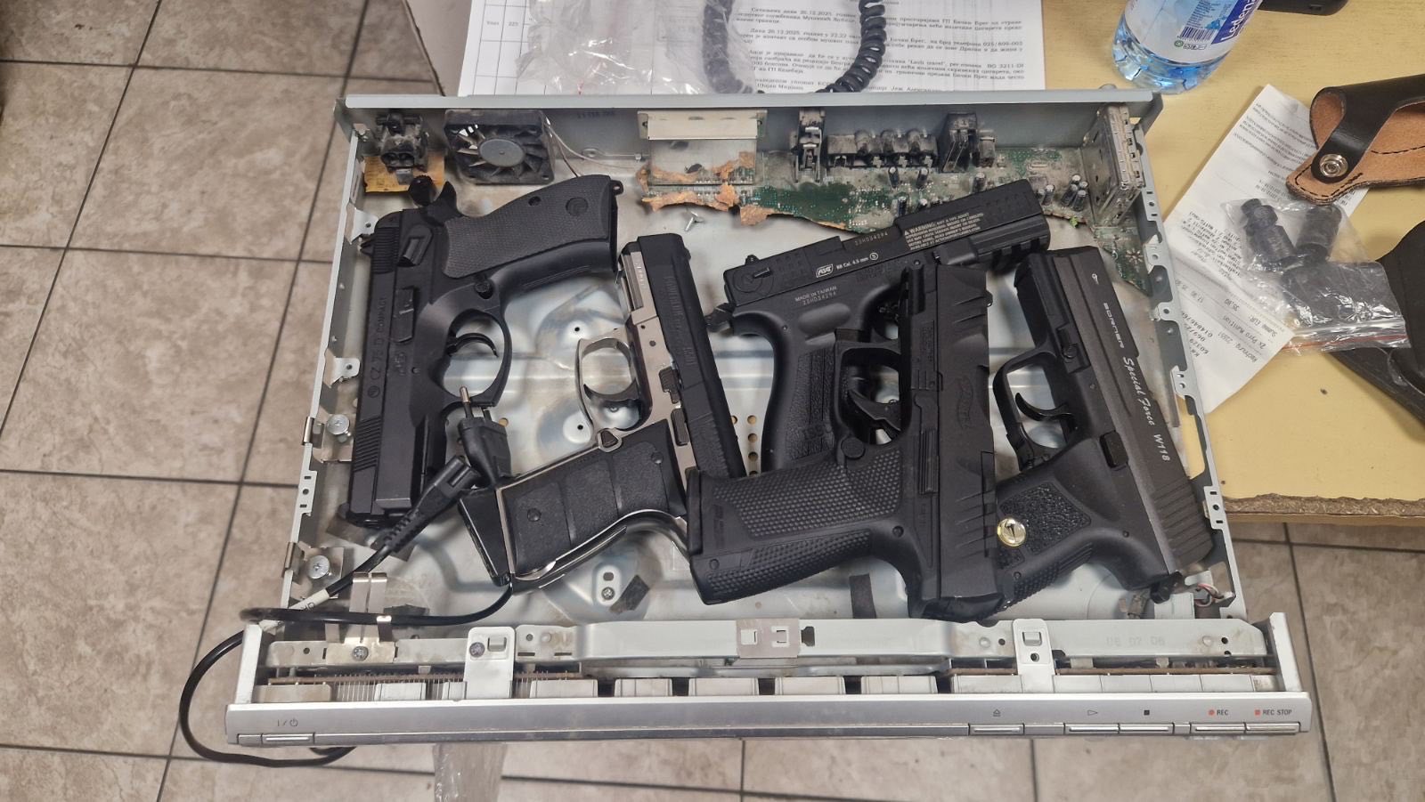 Потом је у истој кутији пронађен двд плејер, у чијој је унутрашњости било скривено пет гасних пиштоља калибра 9мм и 4,5мм са припадајућим оквирима.