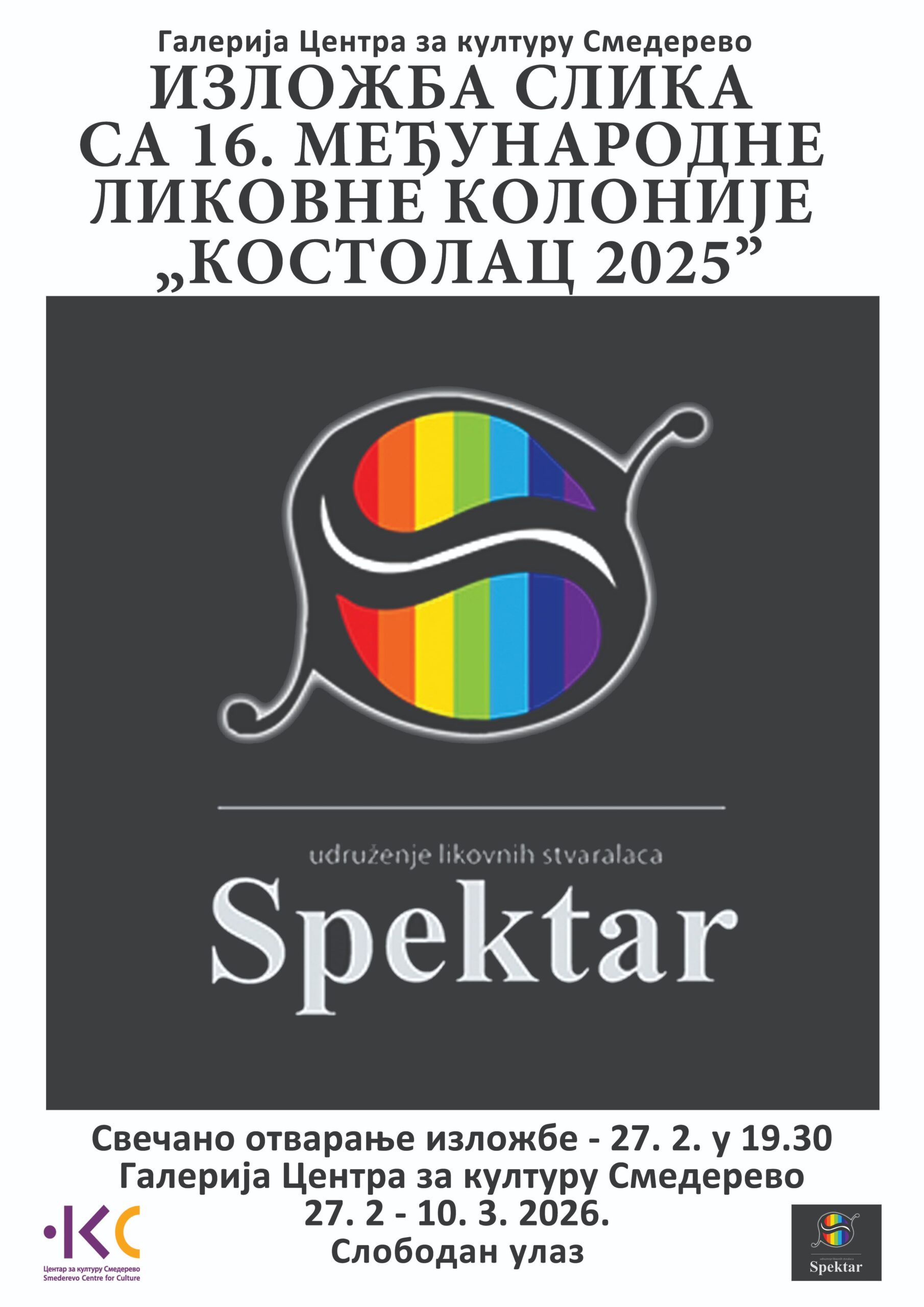 U galeriji Centra za kulturu Smederevo biti otvorena izložba slika sa 16. međunarodne likovne kolonije „Kostolac 2025”. Publika će imati priliku da pogleda 25 slika različitih formata, tematika i tehnika. Program otvaranja počinje u 19.30