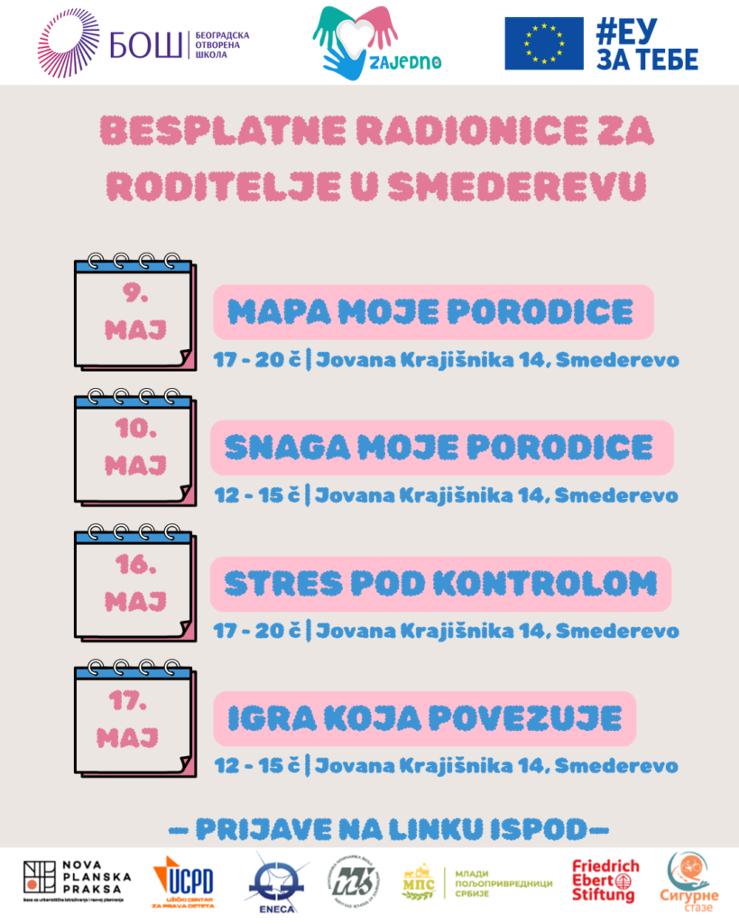 Poziv roditeljima da se prijave na besplatne radionice psihosocijalne podrške koje se organizuju u maju mesecu u okviru projekta ,,Da briga o porodici bude briga svih nas”. Projekat se realizuje u okviru ,,EU Resurs centra za civilno društvo u Srbiji” koji Beogradska otvorena škola sprovodi sa partnerima uz podršku Evropske unije.